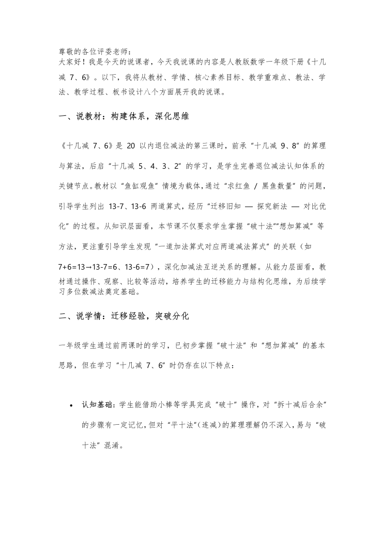 尊敬的各位评委老师:大家好!我是今天的说课者,今天我说课的内容是人教版数学一年级下册《十几减7、6》。以下,我将从教材、学情、核心素养目标、教学重难点、教法、学法、教学过程、板书设计八个方面展开我的说课。一、说教材:构建体系,深化思维《十几减7、6》是20以内退位减法的第三课时,前承“十几减9、8”的算理与算法,后启“十几减5、4、3、2”的学习,是学生完善退位减法认知体系的关镀节点。教材以“鱼缸观鱼”情境为载体,通过“求红鱼/黑鱼数量”的问题,引导学生列出13-7、13-6两道算式,经历“迁移旧知一探究新法一对比优化”的过程。从知识层面看,本节课不仅要求学生掌握“破十法"“想加算减”等方法,更注重引导学生发现“一道加法算式对应两道减法算式”的关联(如7+6=13→13-7=6、13-6=7),深化加减法互逆关系的理解。从能力层面看,教材通过操作、观察、比较等活动,培养学生的迁移能力与结构化思维,为后续学习多位数减法奠定基础。二、说学情:迁移经验,突破分化一年级学生通过前两课时的学习,已初步掌握“破十法”和“想加算减”的基本思路,但在学习“十几减7、6”时仍存在以下特点:·认知基础:学生能借助小棒等学具完成“破十“”操作,对“拆十减后合余”的步骤有一定记忆,但对“平十法“(连减)的算理理解仍不深入,易与“破十法”混淆。