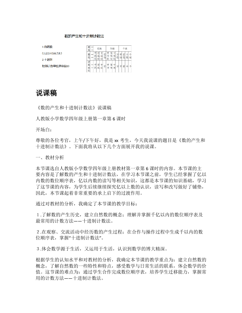 数的产生和十进制计数法1自然数亿版万授个湖0123,4,5,67892.十讲品柑粥引数单位讲率是10说课稿《数的产生和十进制计数法》说课稿人教版小学数学四年级上册第一章第6课时开场白:尊敬的各位考官,上午/下午好,我是x考生,今天我说课的题目是《数的产生和十进制计数法》。下面我将从以下几个方面展开我的说课。一、教材分析本节课选自人教版小学数学四年级上册教材第一章第6课时的内容。本节课的主要内容是了解数的产生和十进制计数法,在学习本节课之前,学生已经掌握了亿以内数的数位顺序表,亿以内数的读写等相关知识,这都是本节课的知识基础,学习了这节课的内容,为学生后续继续探究亿以上数的认识,读写和改写做好了铺垫,因此,本节课起着非常重要的承上启下的过渡作用。通过对教材的分析,我确定了本节课的教学目标:1.了解数的产生历史,建立自然数的概念:理解并掌握千亿以内的数位顺序表及最常用的计数方法一一十进制计数法。2.在观察、交流活动中经历数的产生过程:在合作与操作过程中生成千以内的数位顺序表,掌握“十进制计数法”。3.体会数学源于生活,又运用于生活,认识到数学的博大精深。根据学生的认知水平和对教材的分析,我确定本节课的教学重点为:建立自然数的概念,了解自然数的一些特性和特点,感受数学与日常生活的联系,体会数学的价值。这节课的难点为:通过学生合作完成数位顺序表,培养学生迁移能力,掌握常用的计数方法一一十进制计数法。