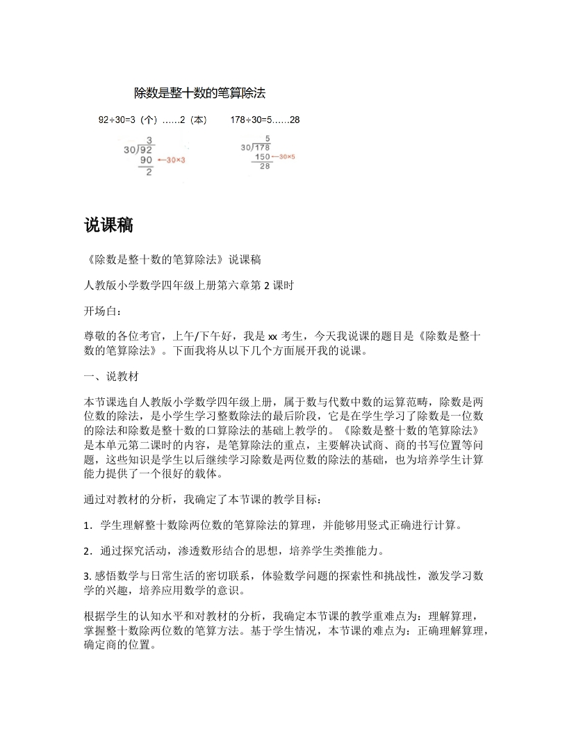 除数是整十数的笔算除法92÷30=3(个).2(本)178÷30=5...283530923017890-30×3150-30×5282说课稿《除数是整十数的笔算除法》说课稿人教版小学数学四年级上册第六章第2课时开场白:尊敬的各位考官,上午/下午好,我是x考生,今天我说课的题目是《除数是整十数的笔算除法》。下面我将从以下几个方面展开我的说课。一、说教材本节课选自人教版小学数学四年级上册,属于数与代数中数的运算范畴,除数是两位数的除法,是小学生学习整数除法的最后阶段,它是在学生学习了除数是一位数的除法和除数是整十数的口算除法的基础上教学的。《除数是整十数的笔算除法》是本单元第二课时的内容,是笔算除法的重点,主要解决试商、商的书写位置等问题,这些知识是学生以后继续学习除数是两位数的除法的基础,也为培养学生计算能力提供了一个很好的载体。通过对教材的分析,我确定了本节课的教学目标:1.学生理解整十数除两位数的笔算除法的算理,并能够用竖式正确进行计算。2.通过探究活动,渗透数形结合的思想,培养学生类推能力。3.感悟数学与日常生活的密切联系,体验数学问题的探索性和挑战性,激发学习数学的兴趣,培养应用数学的意识。根据学生的认知水平和对教材的分析,我确定本节课的教学重难点为:理解算理,掌握整十数除两位数的笔算方法。基于学生情况,本节课的难点为:正确理解算理,确定商的位置。