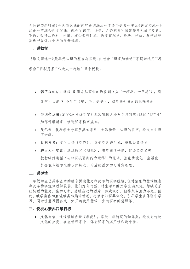 各位评委老师好!今天我说课的内容是统编版一年级下册第一单元《语文园地一》。这是一节综合性学习课,融合了识字、拼音、古诗积累和阅读等多元语文要素。下面,我将从教材、学情、核心素养目标、教学重难点、教法、学法、教学过程及板书设计八个方面展开说课。一、说教材《语文园地一》是单元知识的整合与拓展,共包含“识字加油站“字词句运用“展示台"“日积月累”“和大人一起读”五个板块。·识字加油站:通过6组常见事物的数量词(如“一辆车、一匹马“),引导学生认识7个生字(辆、匹、册等),初步感知量词的正确使用。·字词句运用:复习《汉语拼音字母表》,巩固大小写字母对应:通过“日"“寸“加部件组新字,渗透汉字构字规律。·展示台:鼓励学生分享从其他学科、生活场景中认识的汉字,激发自主识字兴趣。·日积月累:学习古诗《春晓》,感受春天的生机,积累经典诗词。·和大人一起读:通过短文《阳光》,培养阅读兴趣,体会自然之美。教材编排遵循“从知识巩固到能力迁移”的逻辑,注重情境化、生活化,契合低年级学生的认知特点,为后续语文学习奠定基础。二、说学情一年级学生已具备基本的拼音拼读能力和筒单的识字经验,但对抽象的量词概念和汉字构字规律理解较弱。他们好奇心强,对生活中的汉字充满兴趣,却缺乏系统梳理的能力。在学习中,易被生动的图片、游戏吸引,但持久专注力不足。因此,教学需借助直观教具和趣味活动,将抽象知识具体化,引导学生在体验中学习,同时注重习惯养成,如正确使用量词、主动识字的意识等。三、说核心素养四维目标1.文化自信:通过诵读古诗《春晓》,感受中华诗词的韵律美,激发对传统文化的热爱:在生活识字中,体会汉字的实用性和趣味性。