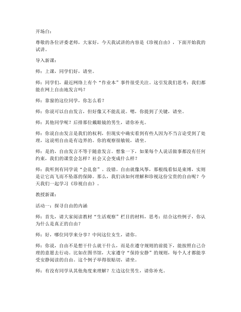 开场白:尊敬的各位评委老师,大家好,今天我试讲的内容是《珍视自由》,下面开始我的试讲。导入新课:师:上课,同学们好,请坐。师:同学们,最近网络上有个“作业本”事件很受关注。这引发我们思考:我们都能在网上自由地发言吗?师:靠窗的这位同学,你怎么看?师:你说可以自由发言,但好像又不能乱说。嗯,你提到了关键,请坐。师:其他同学呢?后排那位戴眼镜的男生,请你补充。师:你说自由发言是我们的权利,但现实中确实看到有些人因为不当言论受到了处理,这说明自由是有边界的。你的观察很敏锐,请坐。师:是的,自由发言不等于随意发言。想象一下,如果每个人说话做事都没有任何约束,我们的课堂会怎样?社会又会变成什么样?师:我听到有同学说“会乱套”。没错。自由就像风筝,那根线看似是束缚,实则是让它高飞而不坠落的保障。那么,我们该如何理解和珍视这份宝贵的自由呢?今天我们一起学习《珍视自由》。教授新课:活动一:探寻自由的内涵师:首先,请大家阅读教材“生活观察”栏目的材料,思考:结合这些例子,你认为什么是真正的自由?师:好,哪位同学来分享?中间这位女生,请你。师:你说,自由不是想干什么就干什么,而是在遵守规则的前提下,能按照自己合理的意愿去行动。比如在图书馆,大家遵守“保持安静”的规则,每个人才都能享受安静阅读的自由。这个例子举得很贴切,请坐。师:有没有同学从其他角度来理解?左边这位男生,请你补充。