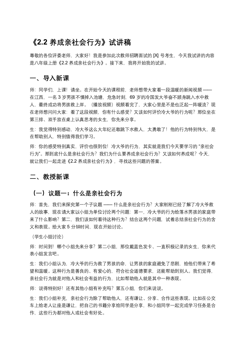 《2.2养成亲社会行为》试讲稿尊敬的各位评委老师,大家好!我是参加此次教师招聘面试的[闪号考生,今天我试讲的内容是八年级上册《2.2养成亲社会行为》。接下来,我将开始我的试讲。一、导入新课师:同学们,上课!请坐。在开始今天的课程前,老师想带大家看一段温暖的新闻视频一在江西,一名3岁男孩不慎掉入池塘,危急时刻,69岁的冷国发大爷奋不顾身跳入水中救人,最终成功将男孩救上岸。(播放视频)视频看完了,大家心里是不是也泛起一阵暖流?现在老师想问问大家:看了这段视频,你有什么感受?又该如何评价冷大爷的行为呢?那位坐在第三排、双手放在桌上认真思考的女生,你先来分享。生:我觉得特别感动,冷大爷这么大年纪还敢跳下水救人,太勇敢了!他的行为特别伟大,是在帮助别人,特别值得我们学习。师:你的感受特别真实,评价也很到位!冷大爷的行为,其实就是我们今天要学习的“亲社会行为”。那到底什么是亲社会行为?我们为什么要养成亲社会行为?又该如何养成呢?今天,就让我们一起走进《22养成亲社会行为》,寻找这些问题的答案。二、教授新课(一)议题一:什么是亲社会行为师:首先,我们来探究第一个子议题一一什么是亲社会行为?大家刚刚已经了解了冷大爷救人的故事,现在请大家以小组为单位讨论两个问题:第一,冷大爷的行为给落水男孩的家庭带来了什么影响?第二,我们该如何看待这种行为?结合这两个问题,试着总结亲社会行为的含义和表现。给大家5分钟时间,现在开始讨论。(学生小组讨论)师:时间到!哪个小组先来分享?第二小组,那位戴蓝色发卡、一直积极记录的女生,你来代表小组发言吧。生:我们小组认为,冷大爷的行为救了男孩的命,让男孩的家庭避免了悲剧,给他们带来了希望和温暖。这种行为是善良的、有爱心的,符合社会道德要求,还能帮助到别人。我们觉得,亲社会行为就是对他人和社会有益的行为,比如帮助他人就是其中一种表现。师:说得特别好!还有其他小组有补充吗?第五小组,你们来说说。生:我们小组补充,亲社会行为除了帮助他人,还有谦让、分享、合作这些表现。比如在公交车上给老人让座是谦让,把自己的书籍分享给同学是分享,和小组同学一起完成学习任务是合作,这些行为都对他人或社会有好处。